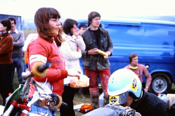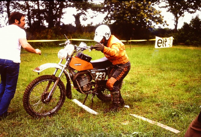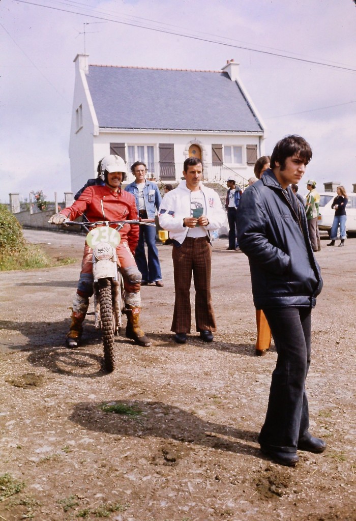 Pantalon pattes d'ef, casque jet Bayard (?) la grande classe le père Edart ! Tellement la classe que même la boue n'ose pas coller au pneu !
