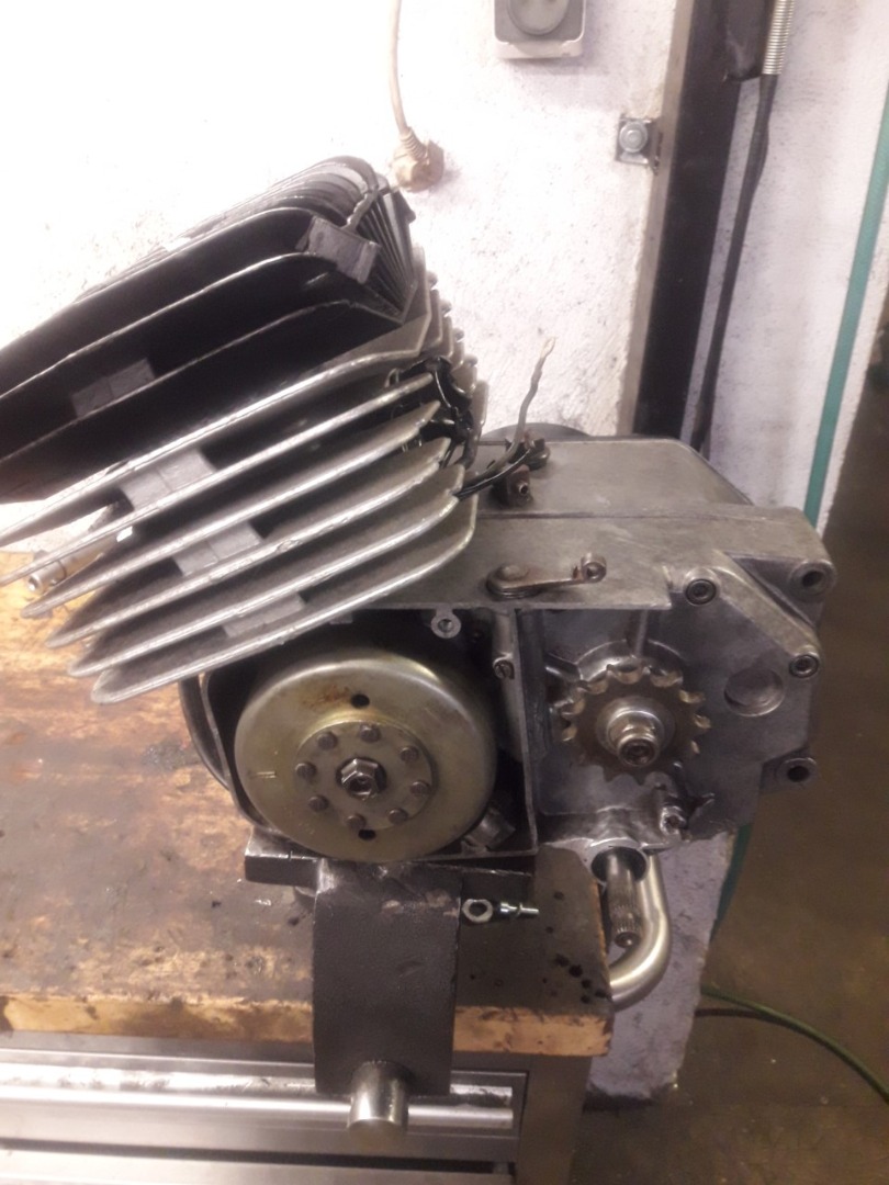 Il revient de trés loin, la bielle avait été coupée à la disqueuse, le carter moteur était cassé au niveau de laxe de selection (la réparation se voit un petit peu sans le carter d'allumage.