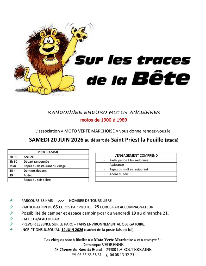 Le départ et le paddock seront à Saint Priest la Feuille à 10 km au sud de Noth à l'ancien terrain de foot.